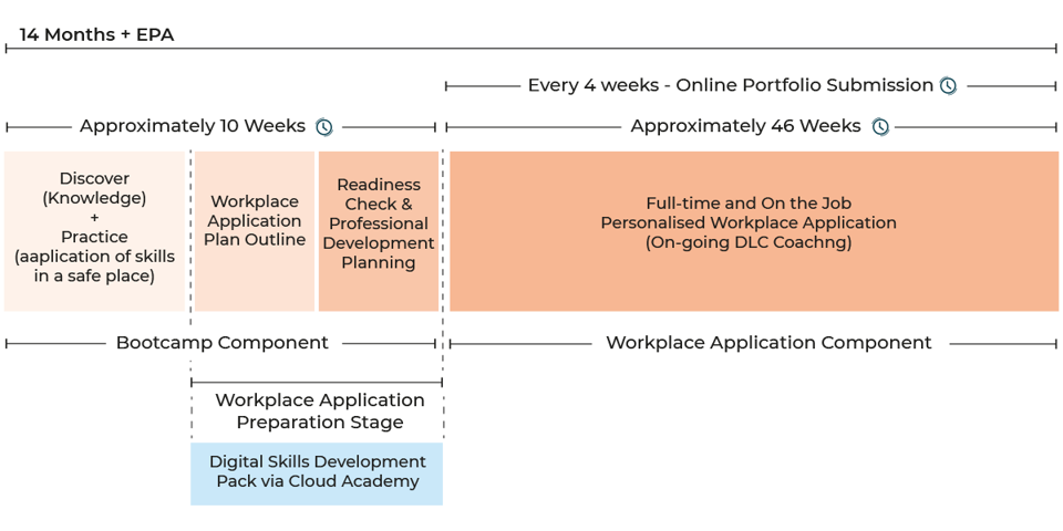 The accelerated apprenticeship provides 10 weeks of up-front bootcamp training to start the learner journey. In bootcamp, learners will gain all the practical knowledge to enter the workplace as a Data Analyst, DevOps practitioner, or Software Engineer. They learn from experts, digital learning pathways, sandbox virtual labs and skills coaching so they are ready to enter your business at its conclusion.